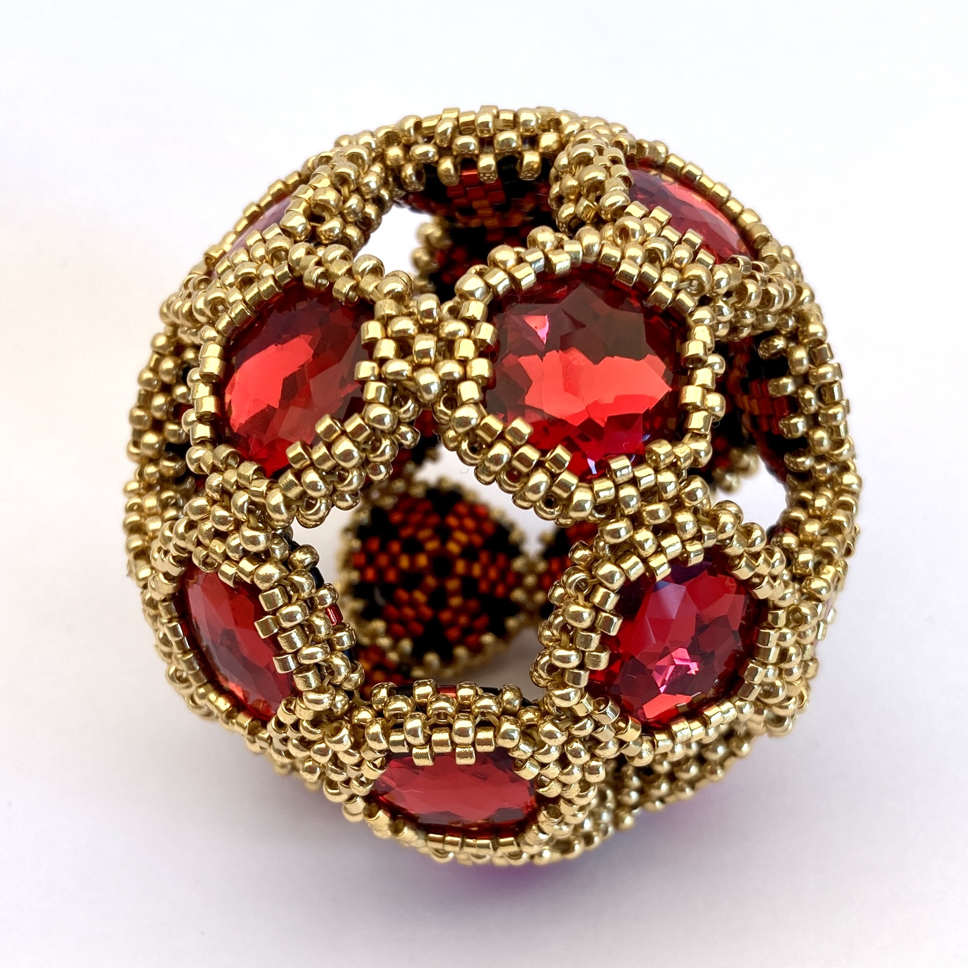 That took me away from flat sheets and back to 3d shapes and got me to thinking about the 3d Geometric shapes which do use Hexagons. The best known of these is of course the Truncated Icosahedron, also known as the Bucky Ball, seen everywhere as the basic patchwork layout for the football (or for the US peeps, a soccer ball). It uses pentagons, each surrounded by a ring of 5 hexagons. All the hexagons are joined, which made me wonder, what would happen if I just missed out the pentagons altogether and left the resulting gaps as voids, viewing windows into the delica bezel backs? Could I create a structure which was rigid enough to feel solid even with the voids? Would the curvature be correct? My engineering brain said ‘maybe, if you have a solid joint, rather than a hinge joint’. In peyote 3d shapes we usually use point beads to join, giving a hinge. If every side has a join then those hinges act in combination to give a solid shape. Any missing sides or joins mean flexibility returns, so the shape won’t be rigid. So I needed to come up with a joint which was solid – it would need a bit of flexbility to allow it to shift during construction, but ultimately needed to lock into a solid formation. Once again the curvature showed me the way to go, and in the tutorial you’ll see how the two part joint gives you the rigidity you need.