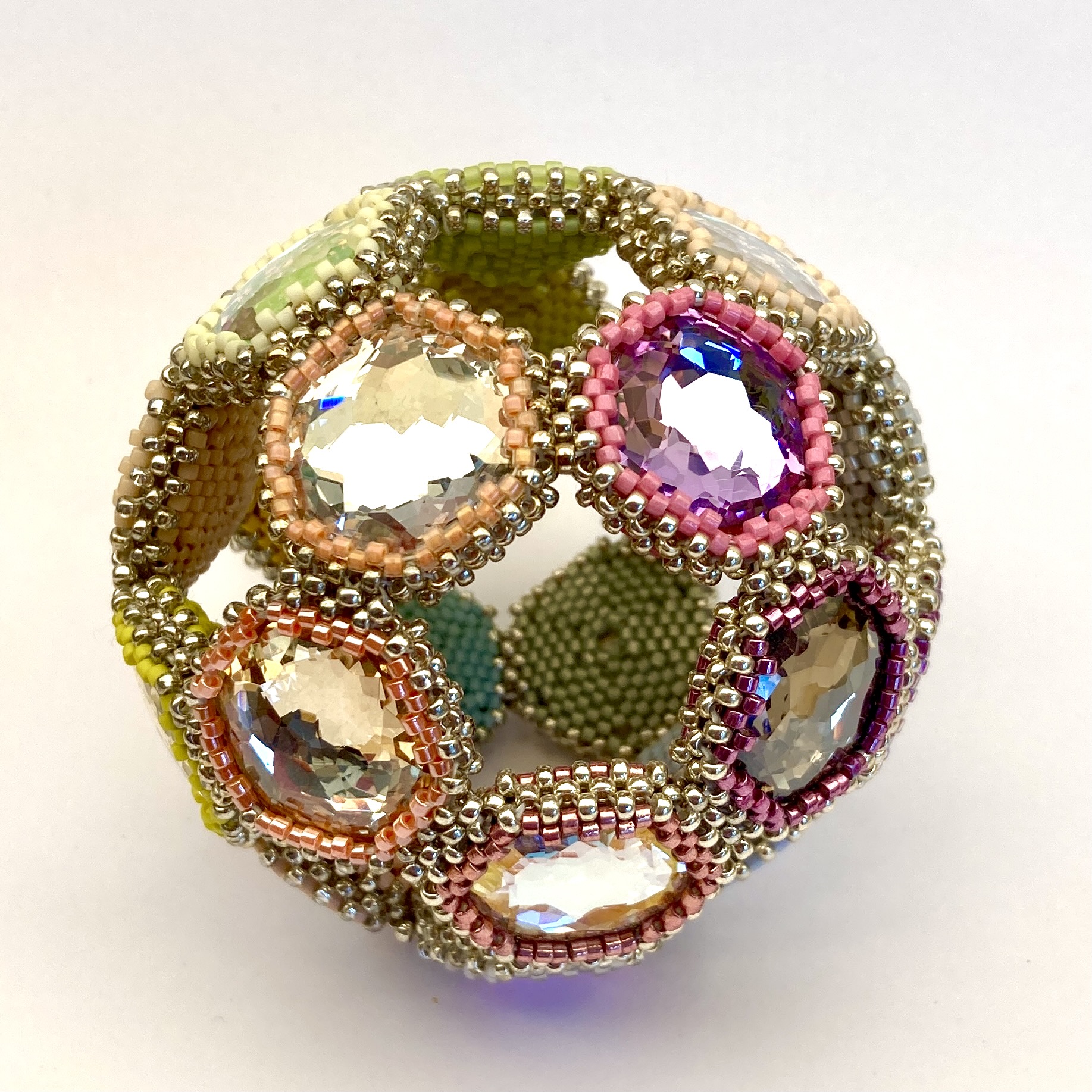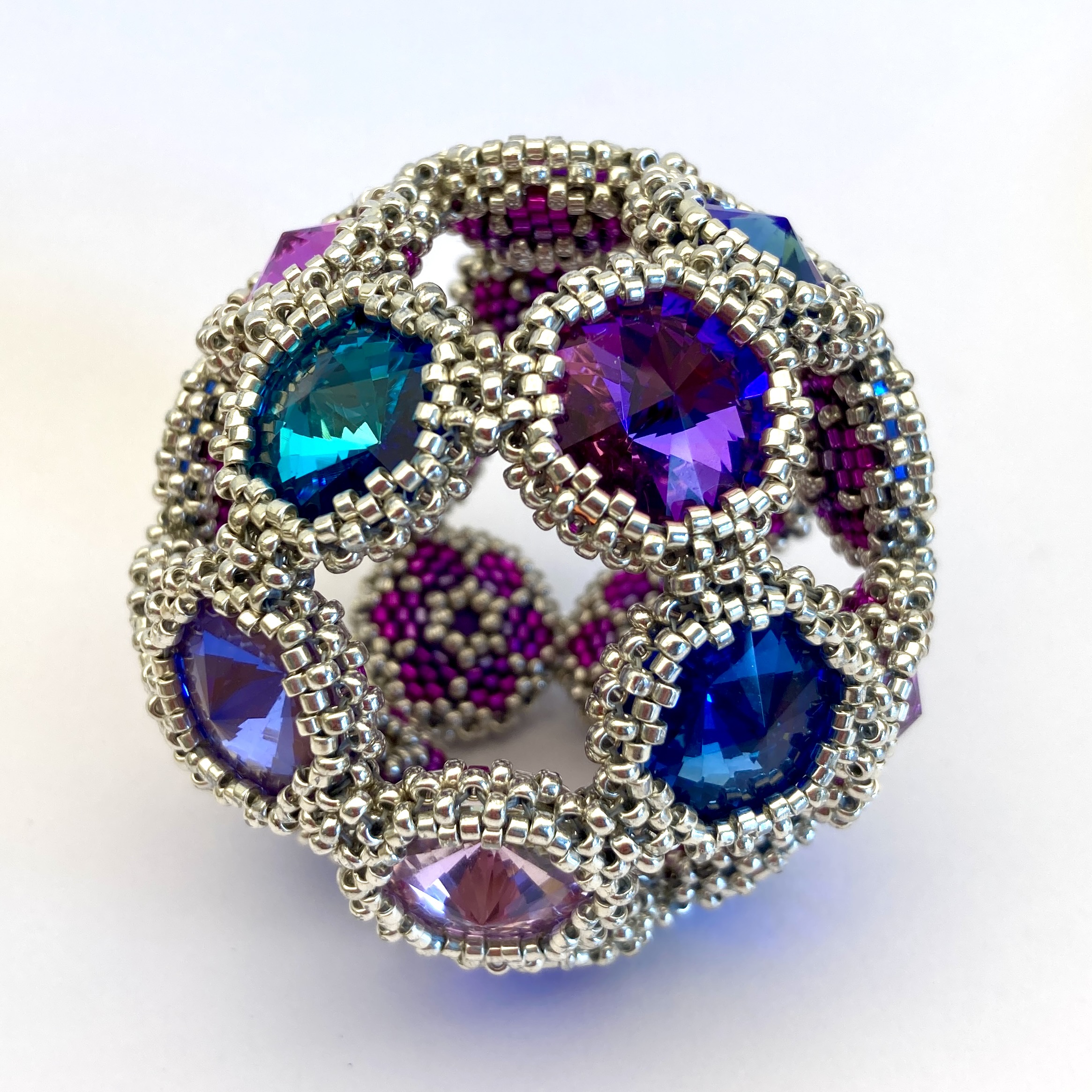 A few months later I was looking at them again, and had a go at my favourite MRAW bezel to see how best to start using them. I always try that first with new cyrstals, and if that fails try peyote combinations, and finally complex 3D netting. It worked, and made a lovely solid bezel (particularly when I used a hexagon on the backs), but when I joined it to another I couldn’t get it to sit flat – whatever combinations of beads and stitches I tried I could only get a nice finish that was either concave or convex.